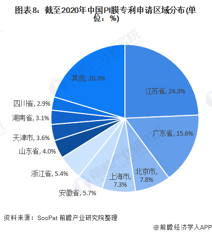 根据在SOOPAT专利网输入“聚酰亚胺薄膜”的查询,截至2020年11月11日,我国PI膜专利申请人主要分布在江苏省、广东省和北京市,分别占比24.3%、15.6%和7.8%。